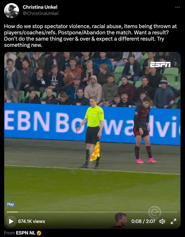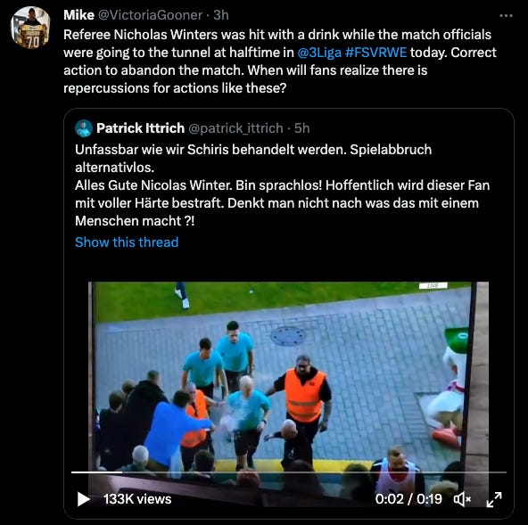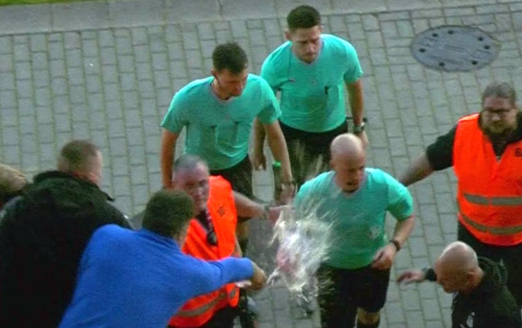 Saw 2 separate incidents today on Twitter of referees having drinks thrown at them from the crowd.